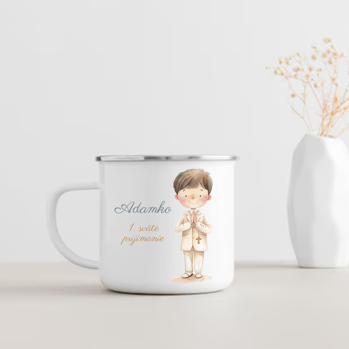 Biely smaltovaný hrnček so strieborným okrajom potlačený grafikou ako pamiatka alebo darček na 1.sv. prijímanie.