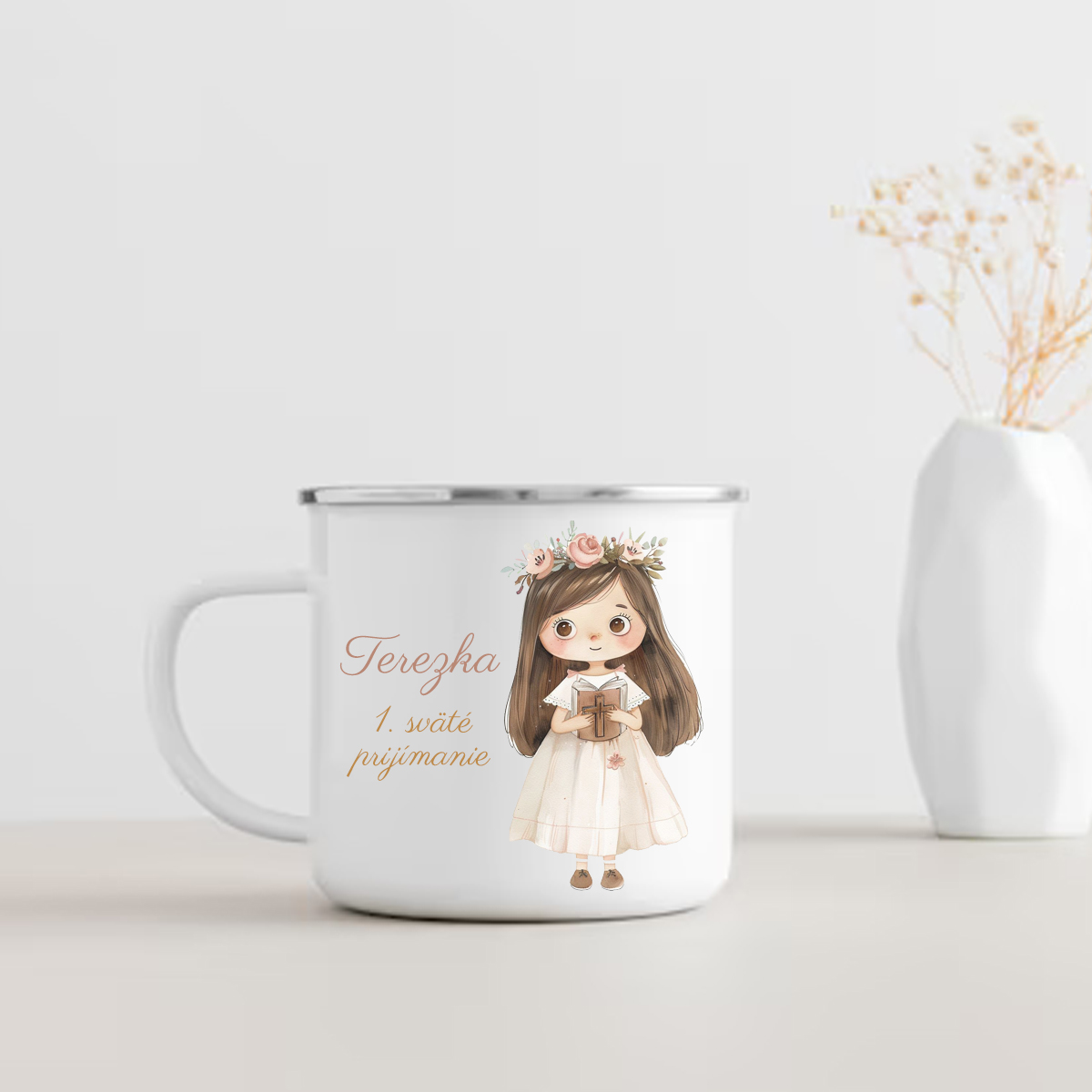 Biely smaltovaný hrnček so strieborným okrajom potlačený grafikou ako pamiatka alebo darček na 1.sv. prijímanie.