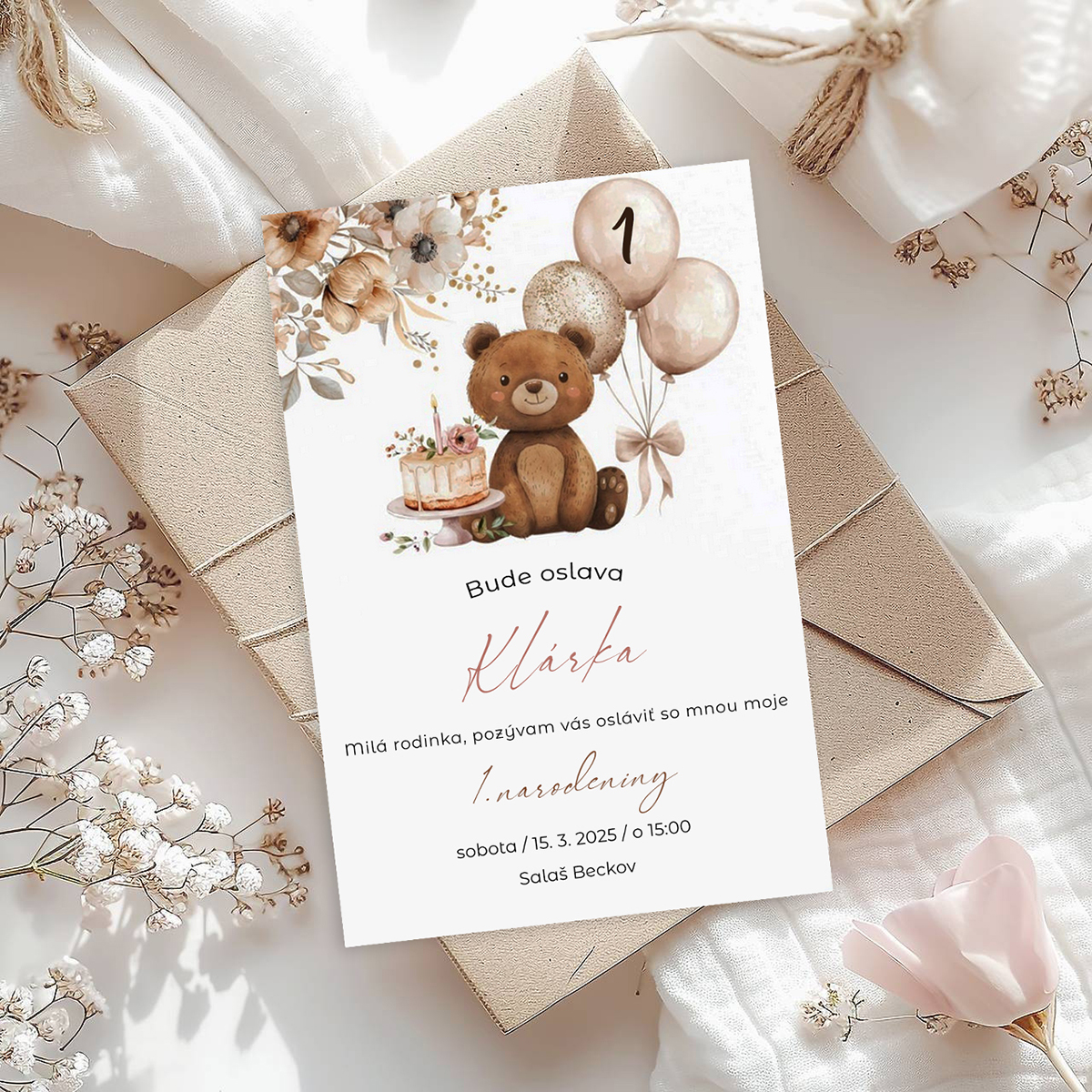 Detská pozvánka na narodeniny s obálkou s mackom tlačená na štruktúrovaný papier, hrúbka 240 gramov.