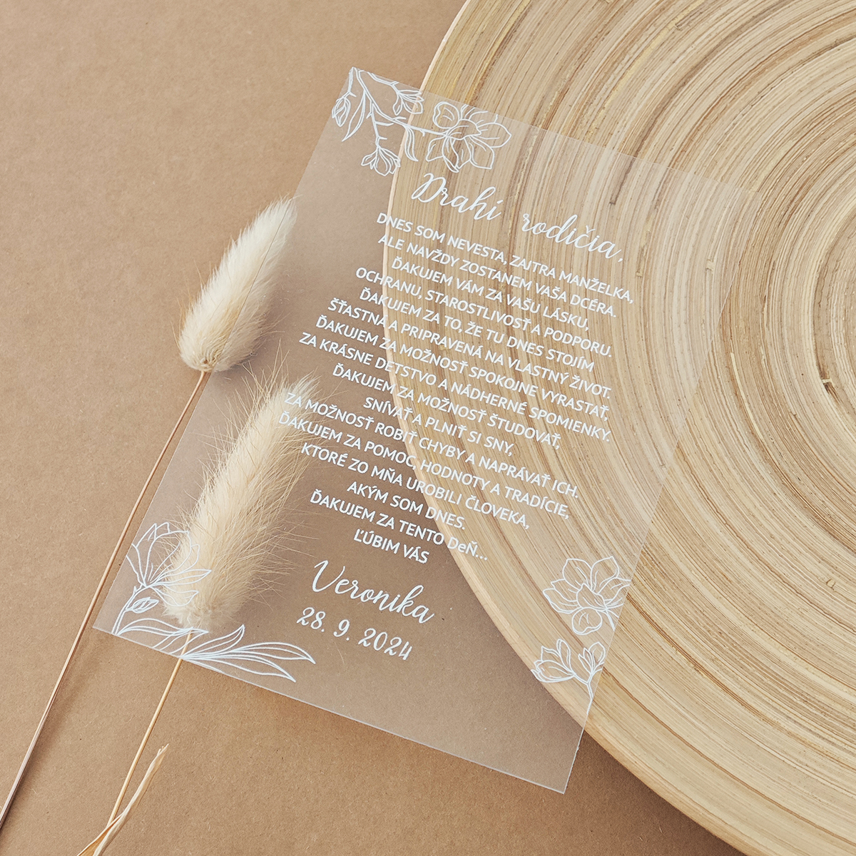 Jednoduché a zároveň veľmi štýlové a moderné transparentné poďakovanie pre svadobných rodičov. Oznámenie je tlačené bielou UV tlačou na transparentné plexi. Vďaka UV tlači je text mierne vystúpený, akoby 3D.