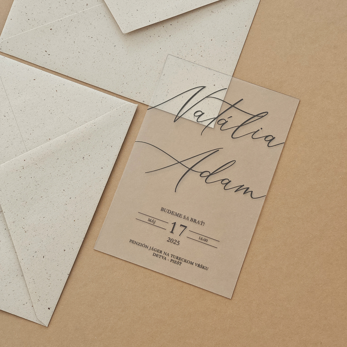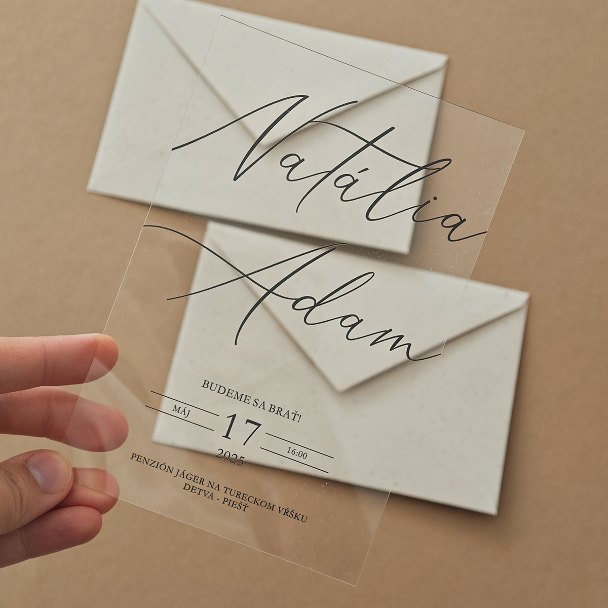 Jednoduché a zároveň veľmi štýlové a moderné transparentné oznámenie. Oznámenie je tlačené čiernou UV tlačou na transparentné plexi. Vďaka UV tlači je text mierne vystúpený, akoby 3D.