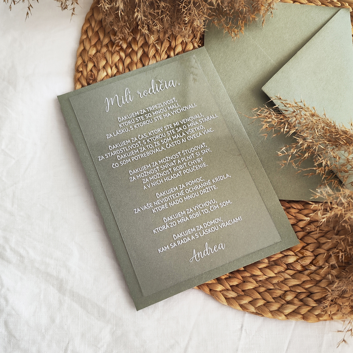 Jednoduché a zároveň veľmi štýlové a moderné transparentné poďakovanie pre svadobných rodičov. Oznámenie je tlačené bielou UV tlačou na transparentné plexi. Vďaka UV tlači je text mierne vystúpený, akoby 3D.