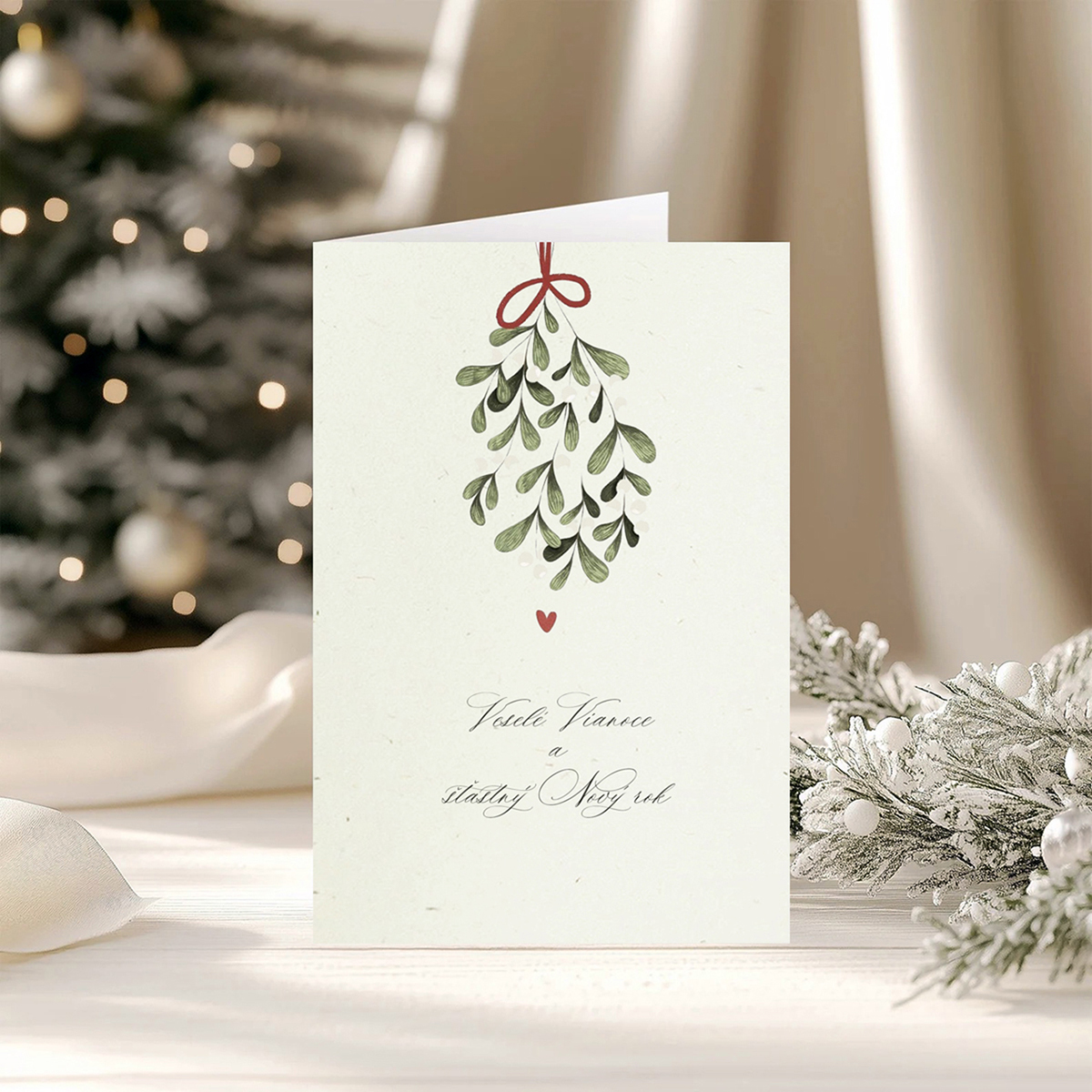 Otváracia vianočná pohľadnica s imelom tlačená na hladký ekologický papier najvyššej kvality s malými čiastočkami. Papier nie je snehobiely, hrúbka 200g.