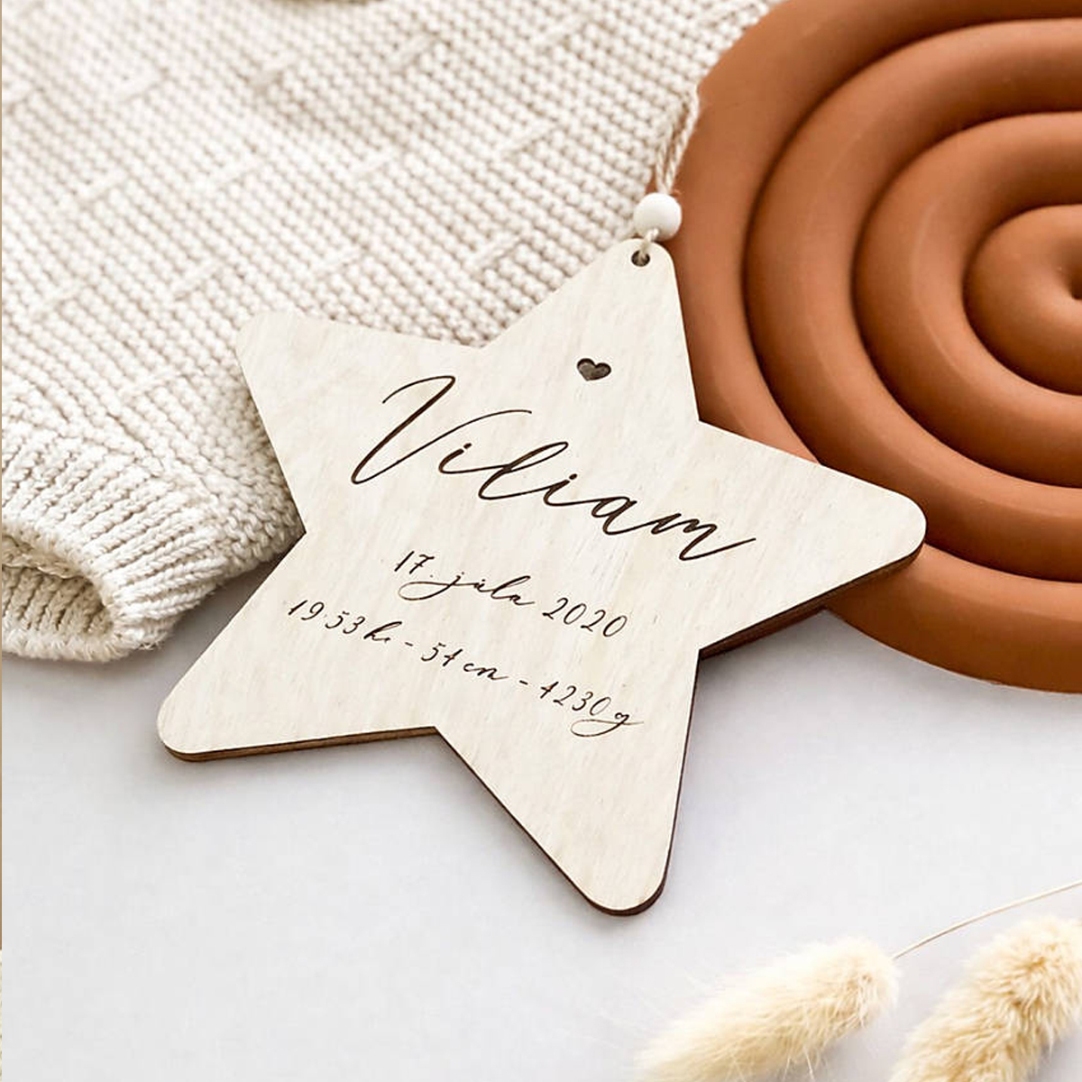 Tabuľka s menom a údajmi o narodení vhodná ako dekorácia do detskej izby. Tabuľka je vyrobená z kvalitnej preglejky hrúbky 4mm s hladkým povrchom a je doplnená šnúrkou s drevenou korálkou.