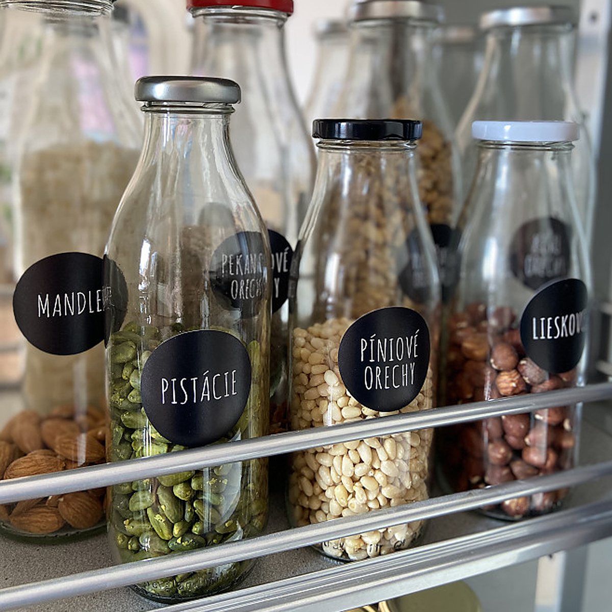 Minimalistické okrúhle nálepky odolné voči vode dokonale doplnia vašu kuchyňu. Vďaka nálepkám môžte označiť rovnaké dózy a dávkovače.