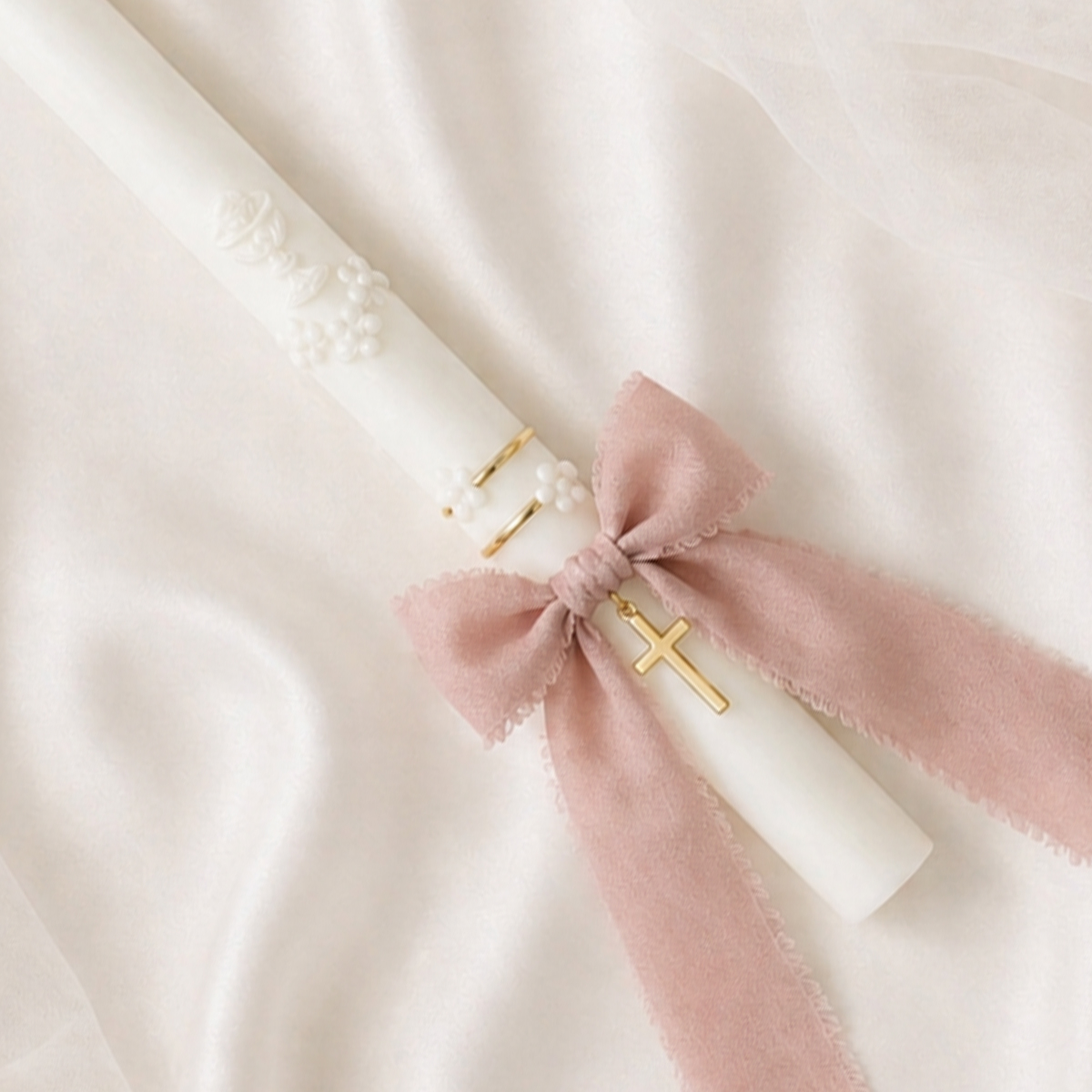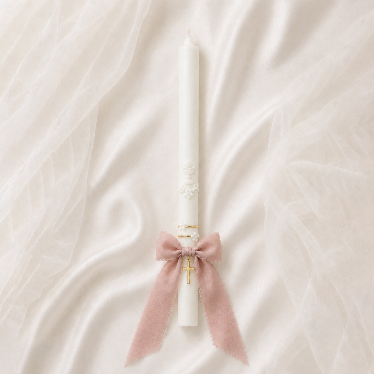 Sviečka na krst alebo prvé sväté prijímanie s kalichom a kvietkami. Doplnená stužkou a zlatým krížikom.