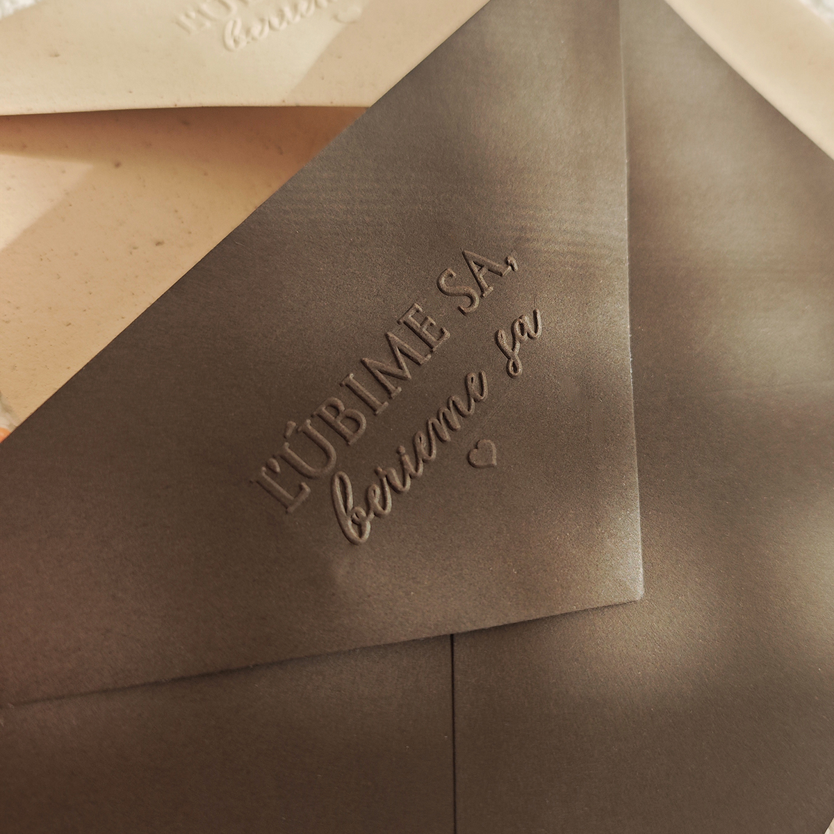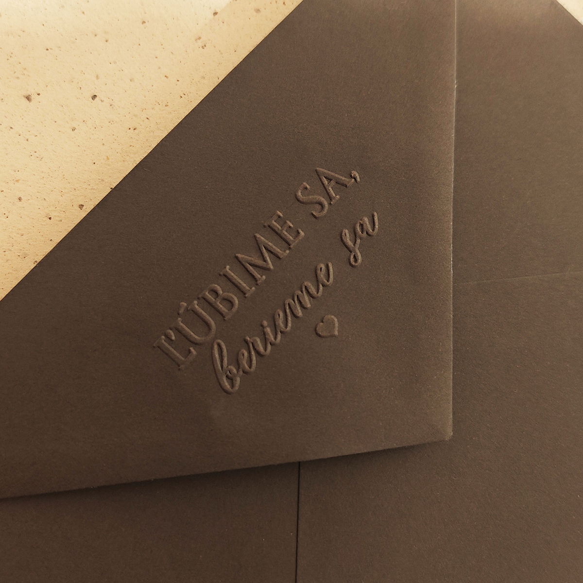 Obálka v klasickej veľkosti C6 (114x162mm) vhodná na svadobné oznámenia, pozvánky alebo pohľadnice. Obálka má vyrazený text ľúbime sa, berieme sa.