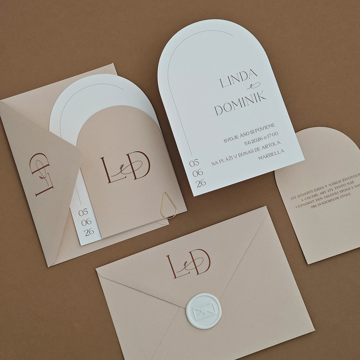 Trendy minimalistické svadobné oznámenie v tvare oblúka. Celý set dokonale doplní výnimočnosť vášho svadobného dňa.