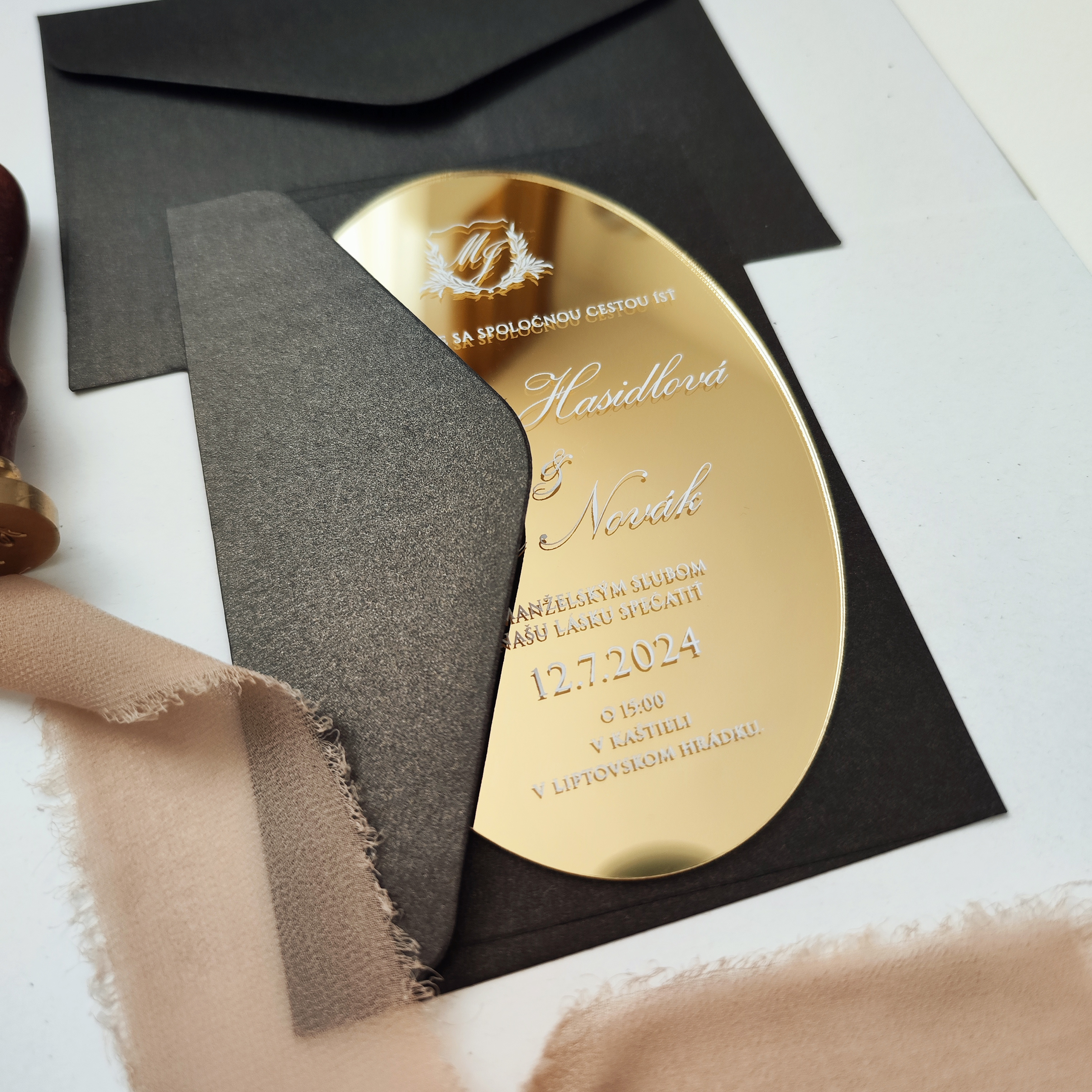 Luxusné a moderné svadobné oznámenie tlačené bielou na zrkadlové plexi v zlatej alebo striebornej farbe.