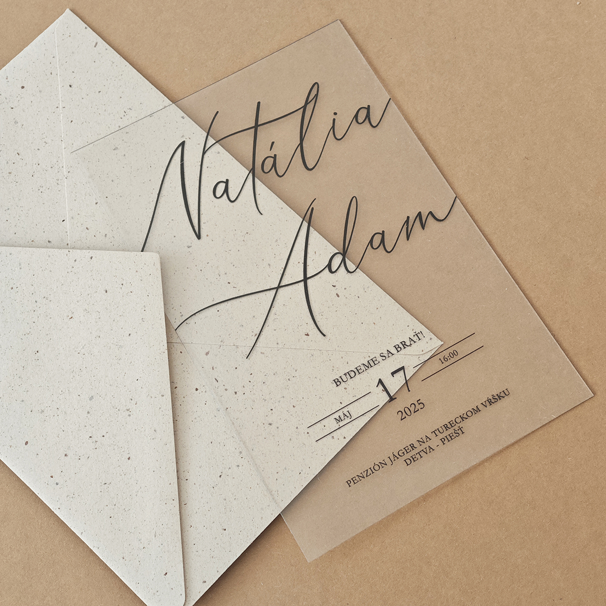 Jednoduché a zároveň veľmi štýlové a moderné transparentné oznámenie. Oznámenie je tlačené čiernou UV tlačou na transparentné plexi. Vďaka UV tlači je text mierne vystúpený, akoby 3D.
