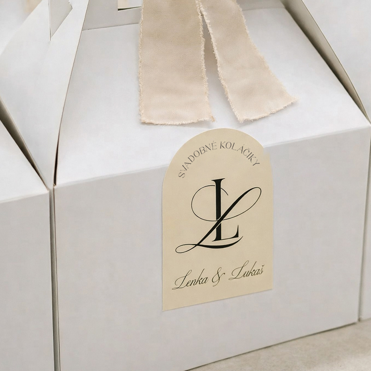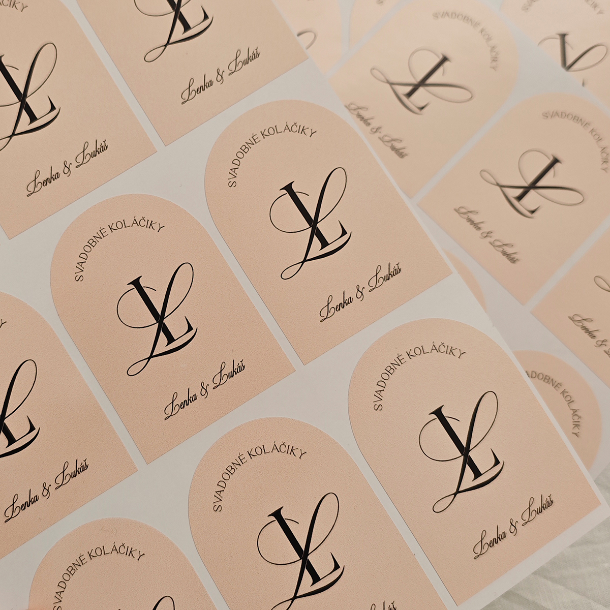 Nálepky na svadobné koláčiky s inicálmi v tvare oblúka. Nálepky sú tlačené na kvalitnú lesklú bielu fóliu, odolnú aj voči vlnkosti. Takže sa nemusíte báť skladovať krabičky v chladničke.