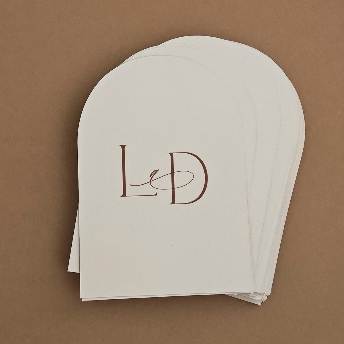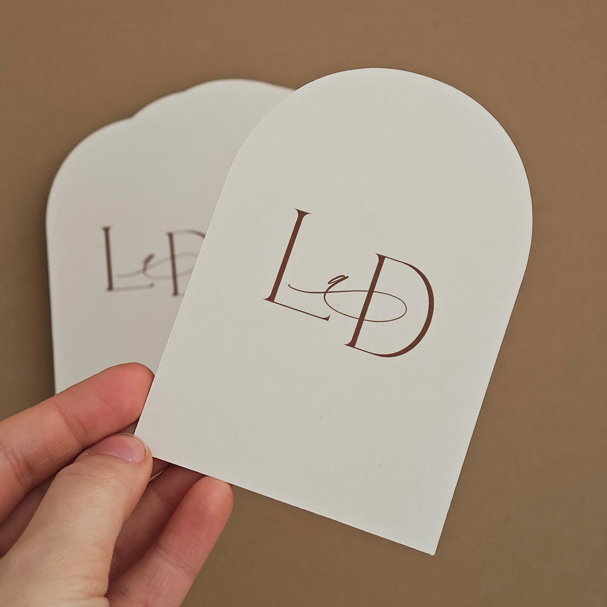 Trendy minimalistická kartička v tvare oblúka s iniciálmi. Text iniciálok je hnedý. Je možné zmeniť ho za čierny bez poplatku navyše.