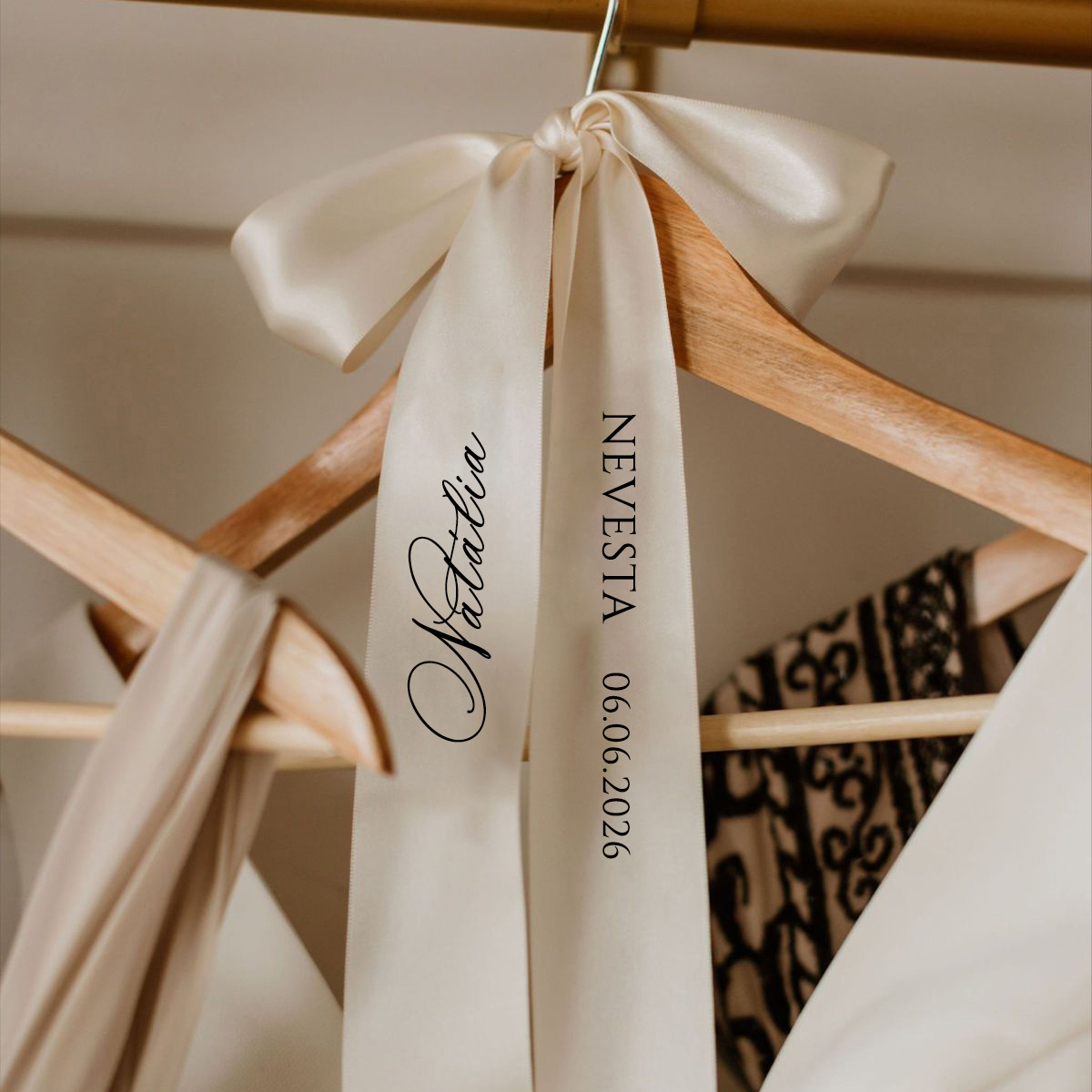 Personalizované stuhy pre nevestu, ženícha či družičky vhodné na svadobné vešiaky. Využiť ich ale môžte aj na stopku pohárov pre nevestu a ženícha, na stoličku alebo na auto.