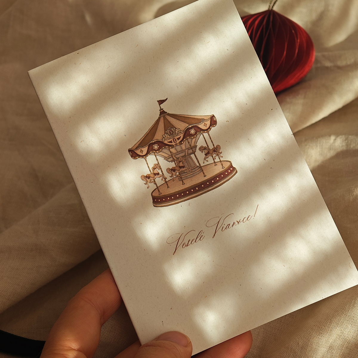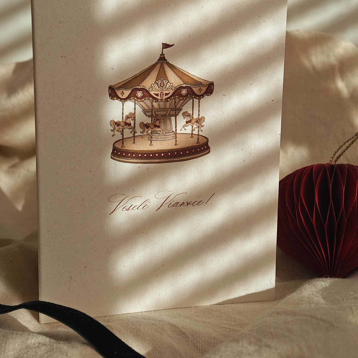 Otváracia vianočná pohľadnica s kolotočom tlačená na hladký ekologický papier najvyššej kvality s malými čiastočkami. Papier nie je snehobiely, hrúbka 200g.
