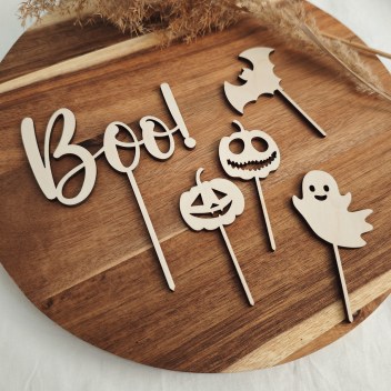 Drevené zápichy na tortu s v téme Halloween skvelo doplnia tématickú tortu alebo koláč. Zápichy sú vyrobené z kvalitnej preglejky hrúbky 4mm.